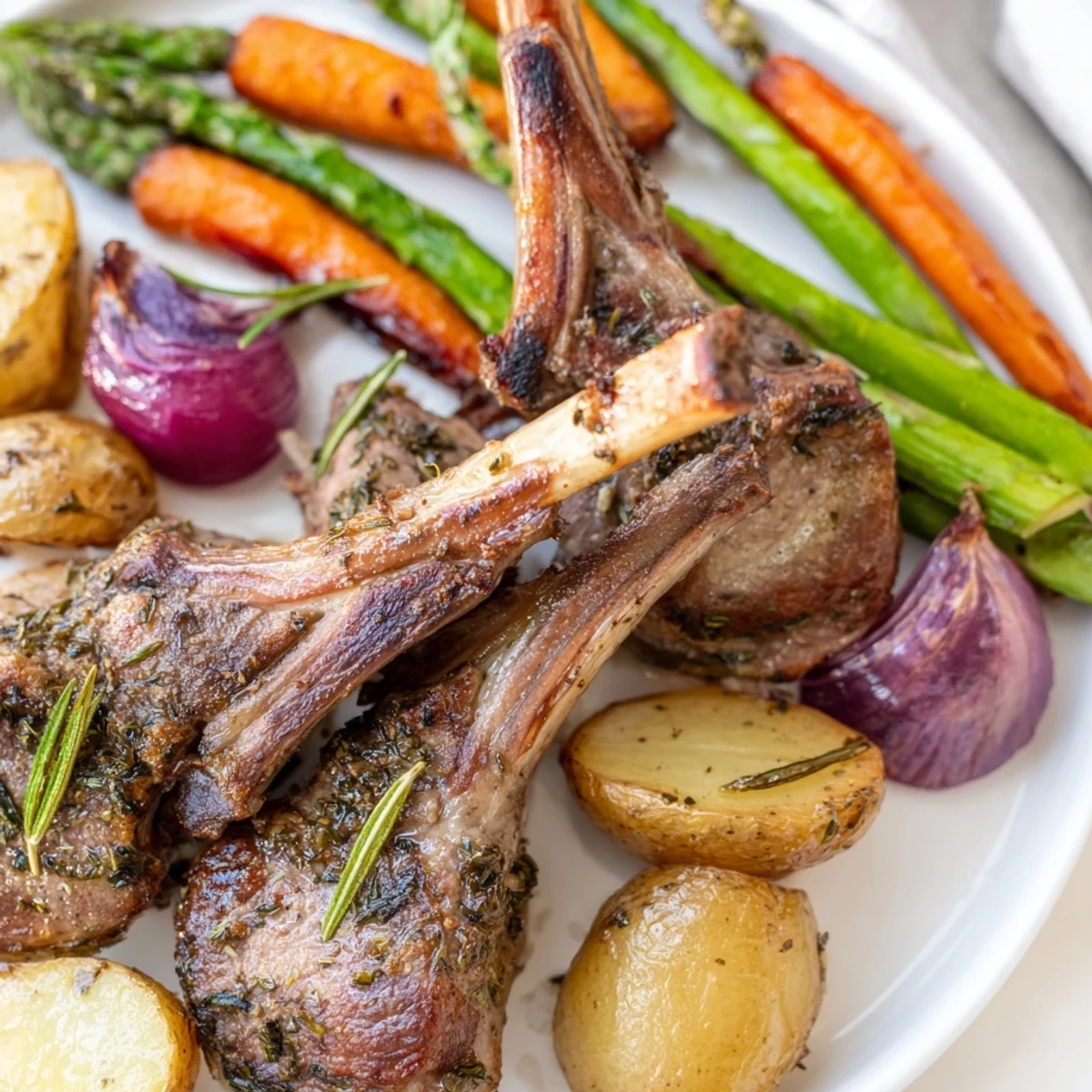 This Easter dinner brings everything together on one sheet pan for effortless cooking and minimal cleanup. Herb-crusted lamb chops roast alongside baby potatoes, carrots, asparagus, and red onion, all infused with rosemary, thyme, garlic, and fresh lemon. The vegetables get a head start in the oven, then the lamb joins them for the final roast until perfectly tender.