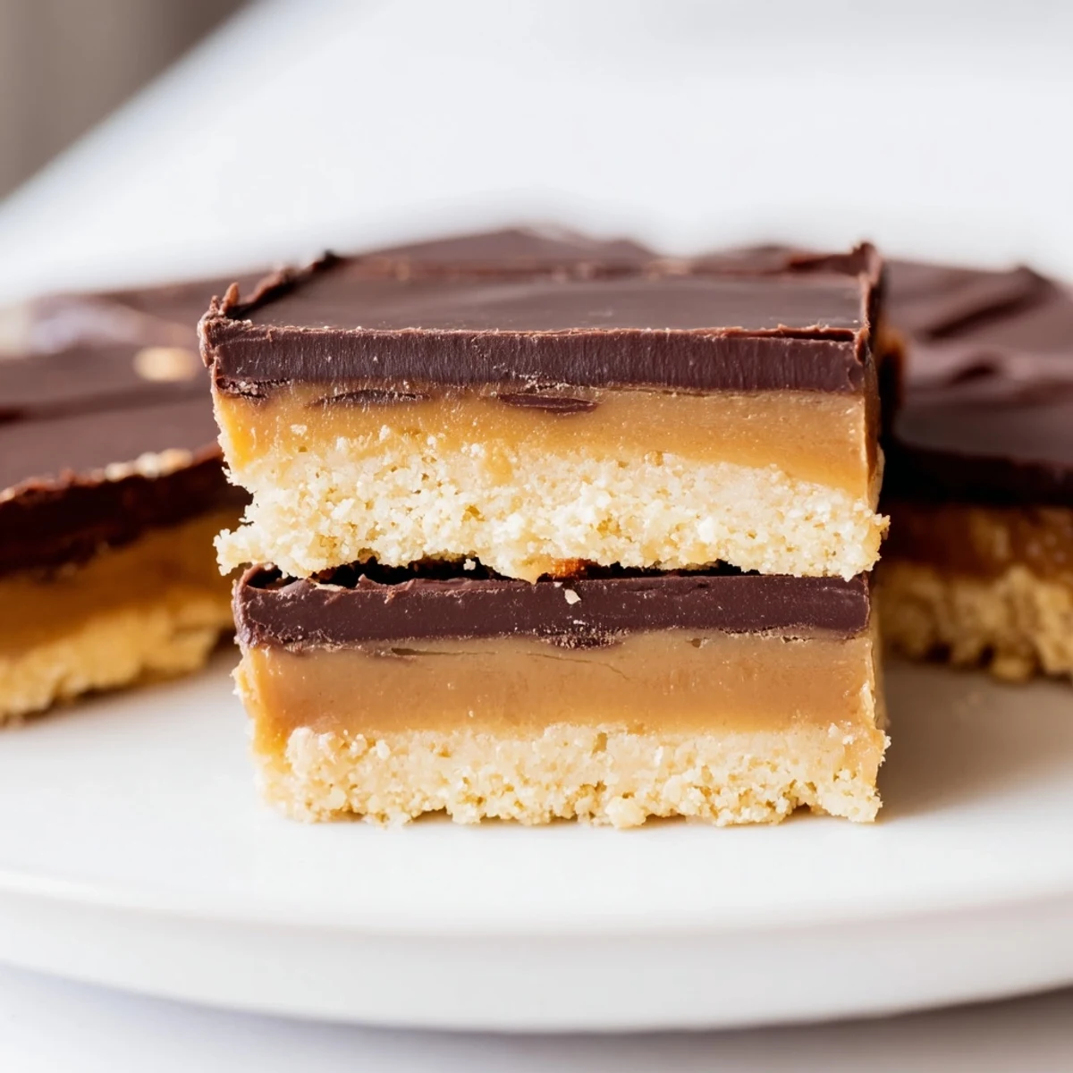 They hold their shape best when stored in the refrigerator. The chocolate layer stays firm and the caramel remains creamy. Serve chilled for the cleanest slices and best texture.