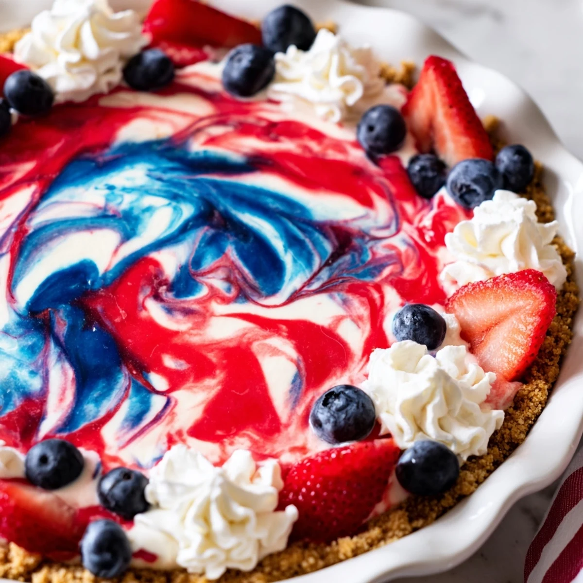 Press graham cracker crumbs mixed with sugar and melted butter into a 9-inch dish and bake until lightly golden. Beat softened cream cheese with powdered sugar, sour cream and vanilla, then fold in whipped cream until smooth. Divide the filling into three, tint two portions red and blue, drop spoonfuls onto the cooled crust and swirl gently. Chill until firm and finish with whipped cream and fresh berries.