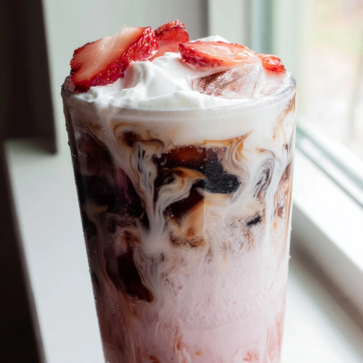 This delightful cold beverage combines fresh strawberry puree with rich dairy and bold coffee for the ultimate summer refreshment. The natural sweetness of ripe strawberries balances beautifully with the smooth creaminess of whole milk and heavy cream, while cold espresso adds depth without overpowering the fruit flavors. Perfect for warm weather, this chilled latte comes together in just 10 minutes with minimal effort—simply cook down strawberries with sugar, blend into a smooth puree, then layer over ice with cold milk and coffee. The result is a gorgeous marbled effect that's as stunning to look at as it is delicious to drink. Top with whipped cream and fresh berries for an extra special touch.